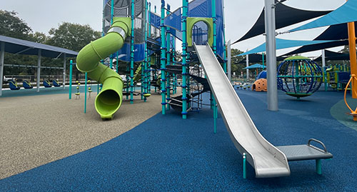 An innovation that is particularly impactful for this North Charleston playground is the use of double-insulated metal slides. These slides are crucial for individuals with cochlear implants, offering them the thrill of the slide without the static interference that often hampers their experience on plastic slides.
